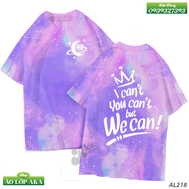 Mẫu áo đồng phục lớp đẹp 9B loang màu tím 3D cực chất, "I can't you can't but we can!", mẫu áo phông lớp hot trend màu sắc độc đáo và đầy cá tính, in áo lớp đẹp giá rẻ theo yêu cầu ở TPHCM và toàn quốc